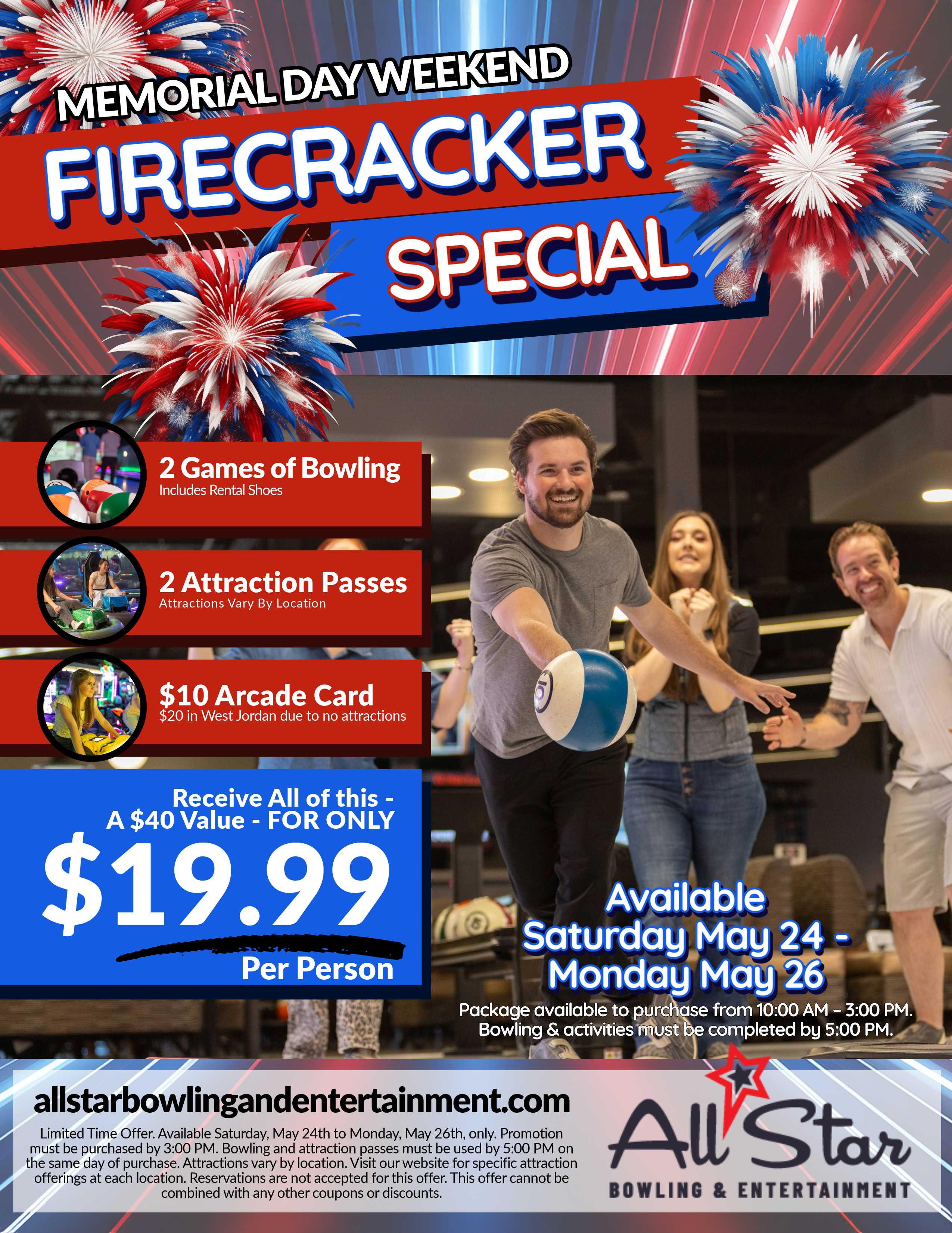 Limited Time Offer. Limited Time Offer. Available December 22, 23, 26, 29, 30 and January 2 only. Promotion must be purchased by 11:30 AM. Bowling and attraction passes must be used by 3:00 PM on the same day of purchase. Attractions vary by location. Visit our website for specific attraction offerings at each location. Reservations are not accepted for this offer. This offer cannot be combined with any other coupons or discounts.