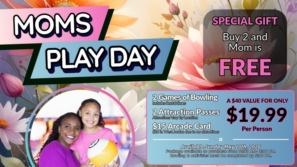 Limited Time Offer. Available Sunday, May 10, 2026, only. Promotion must be purchased by 3:00 PM. Bowling and attraction passes must be used by 5:00 PM on the same day of purchase. Attractions vary by location. Visit our website for specific attraction offerings at each location. Reservations are not accepted for this offer. This offer cannot be combined with any other coupons or discounts.